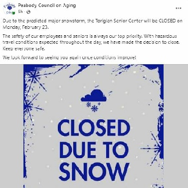 Managed by the Peabody Council on Aging, a service agency of the City of Peabody, the Center meets the diverse interests of Peabody residents in areas such as entertainment, fitness, education, social services, daycare, and recreation.